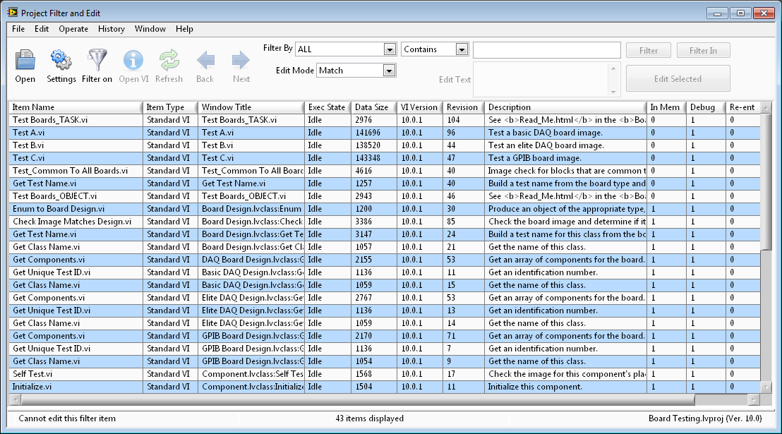 Project Filter and Edit allow all the items in your project to be filtered based on 20 VI properties including VI Description and Allow Debugging. After selecting all or some of the results, many of the specified filtered settings can be modified for all VIs. It is also possible to modify a different property than the filter.